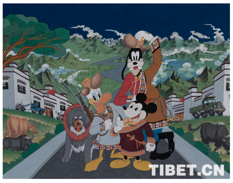 唐卡藝術(shù)家邊巴的新唐卡《逛新城》,同樣的青山綠水,同樣的社會(huì)主義新農(nóng)村,不同的是,他讓米老鼠和唐老鴨穿上藏裝來(lái)做客了。隨著拉薩近年來(lái)的城市巨變,知名企業(yè)、品牌進(jìn)駐城市,也以獨(dú)特的風(fēng)格資源和自身亮點(diǎn)成為旅游勝地,一個(gè)嶄新而充滿活力的現(xiàn)代化拉薩正在崛起。作品在傳統(tǒng)與現(xiàn)代之間所傳遞的沖撞與融合,展現(xiàn)的自信與從容,正是中華文化的主流價(jià)值所在。