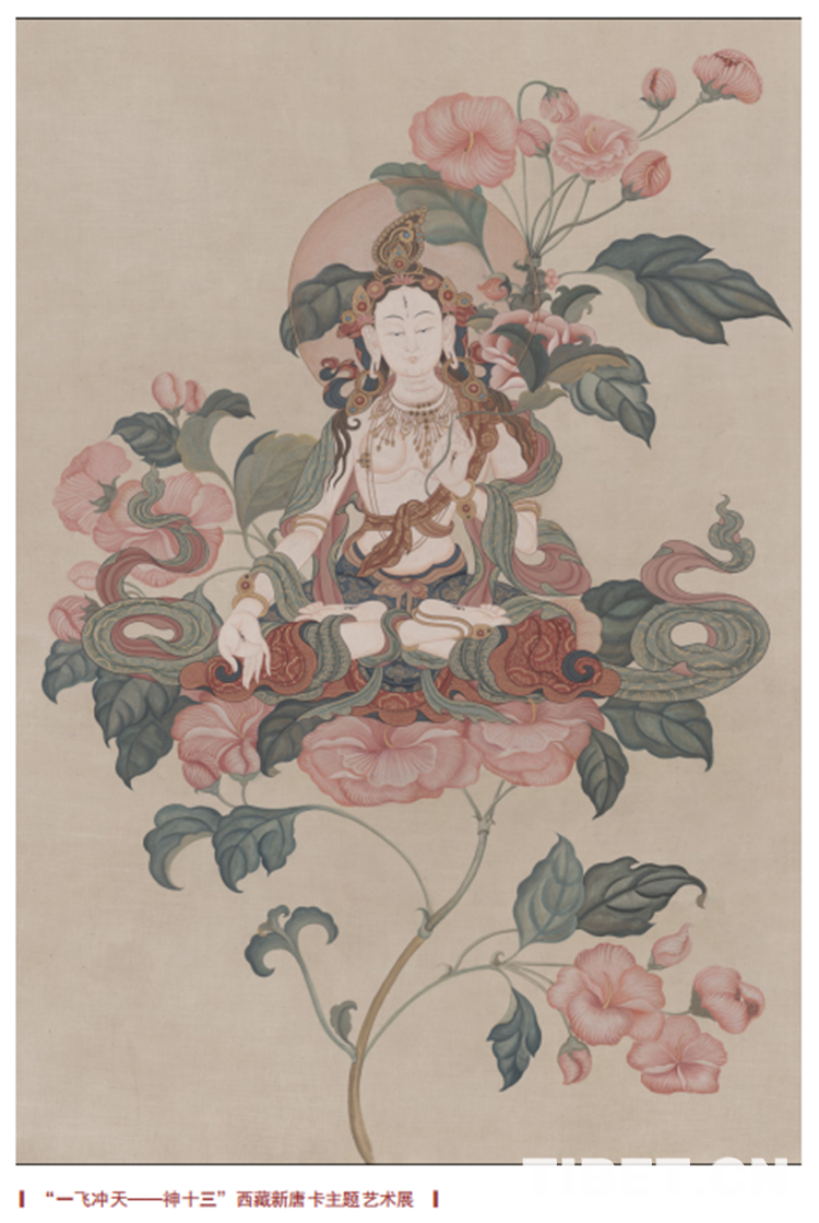 唐卡藝術(shù)家王天文所繪新唐卡《花與佛》則以女性特有的松活靈動(dòng),將工筆的花卉與白度母融合在一起,通過(guò)繪畫達(dá)成了新的意境……