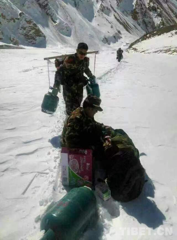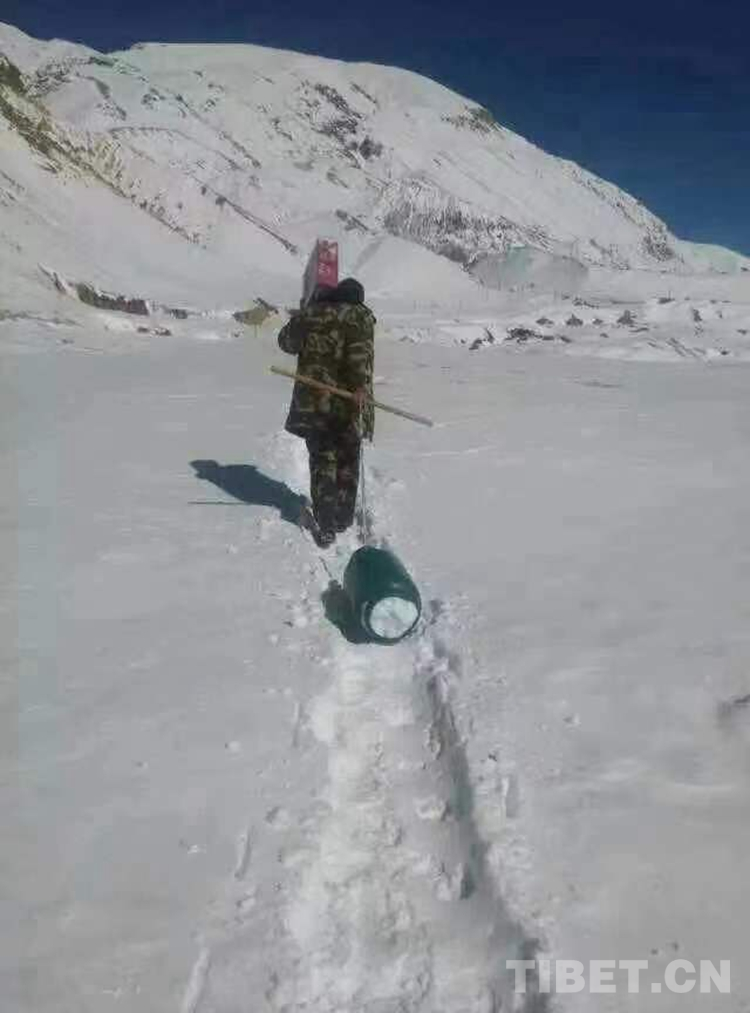 圖為尼瑪國(guó)杰與戰(zhàn)友一起輸送補(bǔ)給物資回執(zhí)勤點(diǎn)路上