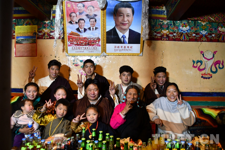 “尼瑪,拉姆,快過來獻(xiàn)哈達(dá)了!”索朗仁青一邊招呼著自己的孫子、孫女,一邊整理著手中的哈達(dá)。“向領(lǐng)袖獻(xiàn)哈達(dá)是我們家每年不變的傳統(tǒng),我們永遠(yuǎn)感謝偉大領(lǐng)袖,感謝共產(chǎn)黨?!彼骼嗜是嘁患仪f嚴(yán)面向墻上懸掛的領(lǐng)袖像,高舉哈達(dá),齊聲祝福:“扎西德勒!”