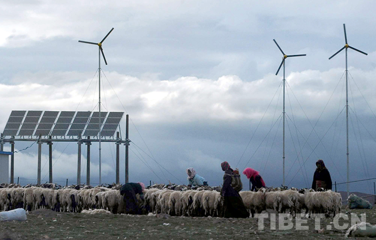 這是那曲地區(qū)雙湖特別區(qū)(現(xiàn)那曲市雙湖縣)牧民在風(fēng)光互補(bǔ)電站前擠羊奶(唐召明2009年7月30日攝)