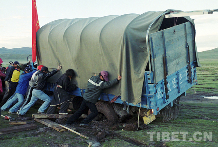 藏北無人區(qū)對于科考人員的真正考驗,是從離開那曲地區(qū)雙湖特別行政區(qū)(現(xiàn)那曲市雙湖縣)開始的??瓶缄牭谝惶斐鰩煵焕蛔吡?公里,東風牌卡車就陷入近幾年干枯的湖底淤泥中,進退兩難。用同行的越野小車,前拉后拽也無濟于事,且輪胎越陷越深。雙湖特別區(qū)森林公安處隊員乘車趕回“雙湖”求救。3位司機用千斤頂和枕木頂車,其他人員到處撿石頭填到車輪下,一點點地將車身抬起。終于等來了從“雙湖”開來的救援卡車,藍色越野小車急忙調(diào)頭讓路,一不小心掉進泥潭,動彈不得。大家決定:先將卡車救出險地。然后,再救越野小車。結(jié)果是一波未平又起一波,營救車剛將卡車拖離泥潭,卻又掉進后面一個更大更深的泥沼中。直到晚上8時,才最終將兩輛車拉出泥沼,科考隊只好返回出發(fā)地點。