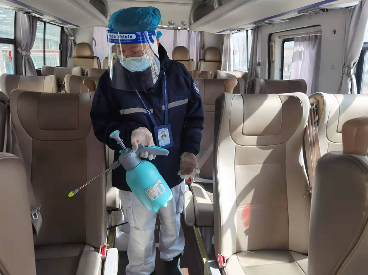 圖為達(dá)娃央金醫(yī)生在對旅客班車進行消毒