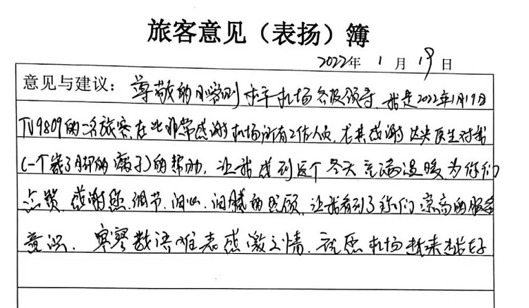 一封感謝信,寥寥數(shù)語表達(dá)了旅客對機場服務(wù)工作的理解和美好祝愿,繁忙的春運工作在冬日里多了一點溫度。