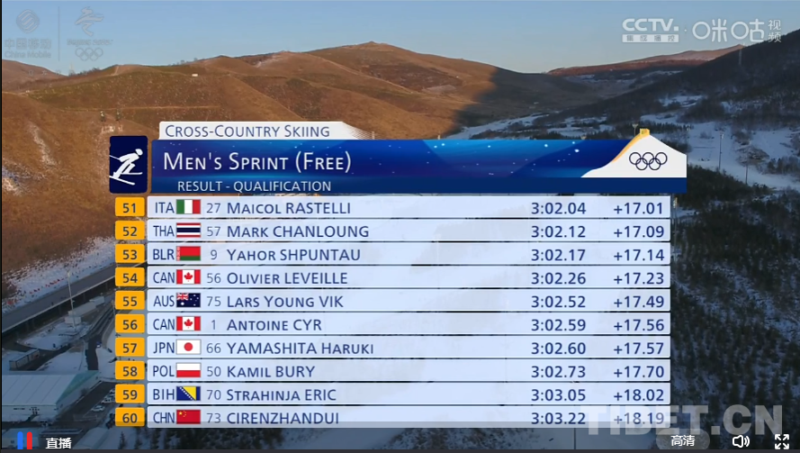 圖為北京冬奧會(huì)越野滑雪個(gè)人短距離(自由技術(shù))資格賽成績