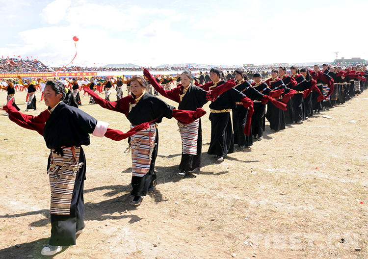 這是在藏北首府那曲鎮(zhèn)賽馬會(huì)上,牧民群眾所跳的大型“鍋莊”舞(唐召明2013年8月10日攝)