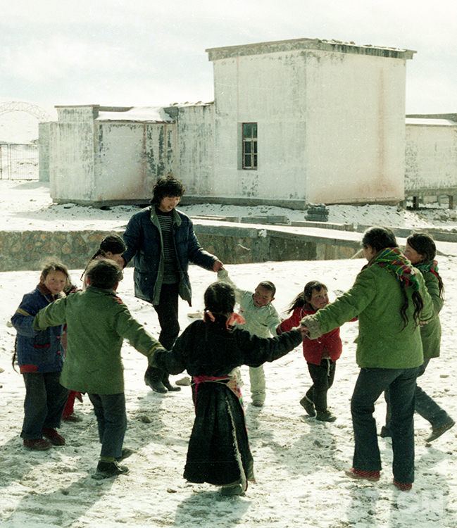 這是青藏公路線(xiàn)上的唐古拉山道班小學(xué)師生,在課間活動(dòng)中跳起“鍋莊”舞(唐召明1990年攝)
