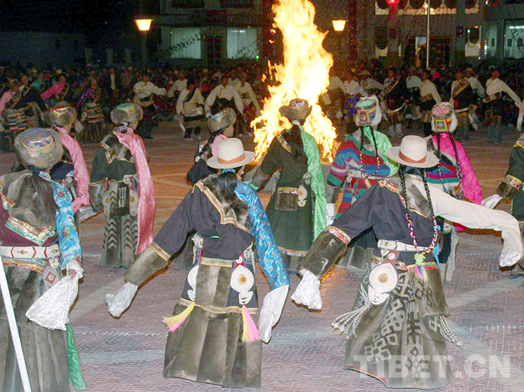這是那曲地區(qū)雙湖特別區(qū)(現(xiàn)那曲市雙湖縣)牧民群眾在“撤區(qū)建縣”慶祝大會(huì)活動(dòng)中,圍著篝火跳起歡樂(lè)的“鍋莊”舞(唐召明2013年攝)