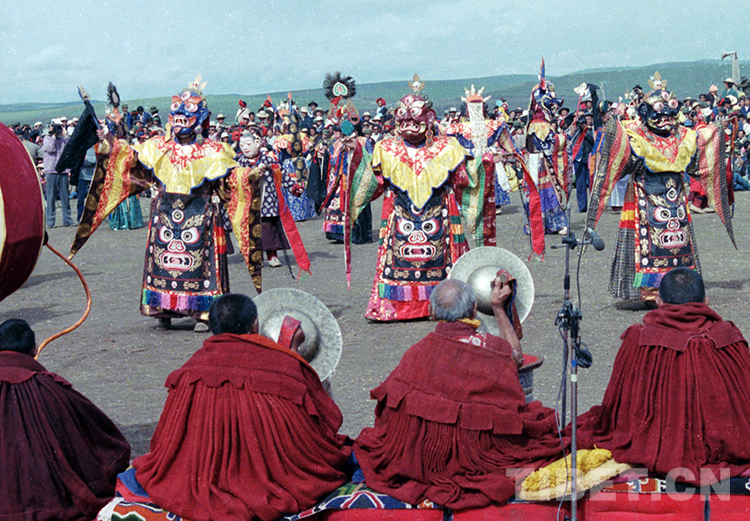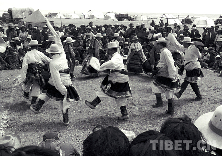 這是在藏北首府那曲鎮(zhèn)賽馬會(huì)上,僧人跳起的寺廟“鍋莊”舞(唐召明1987年攝)
