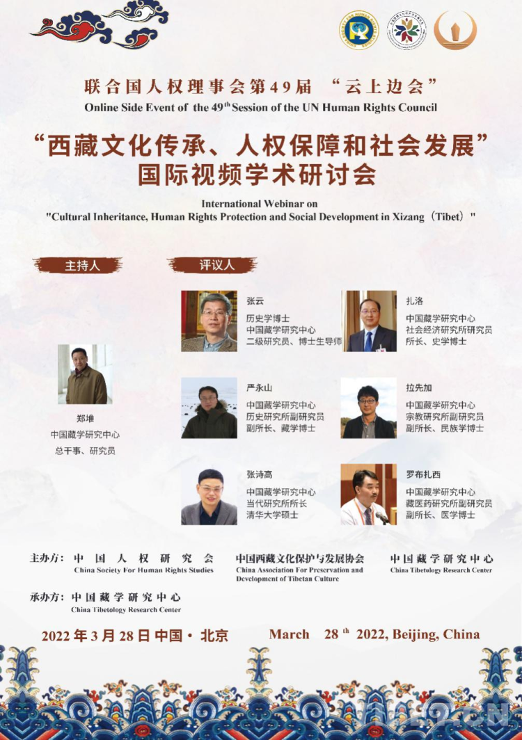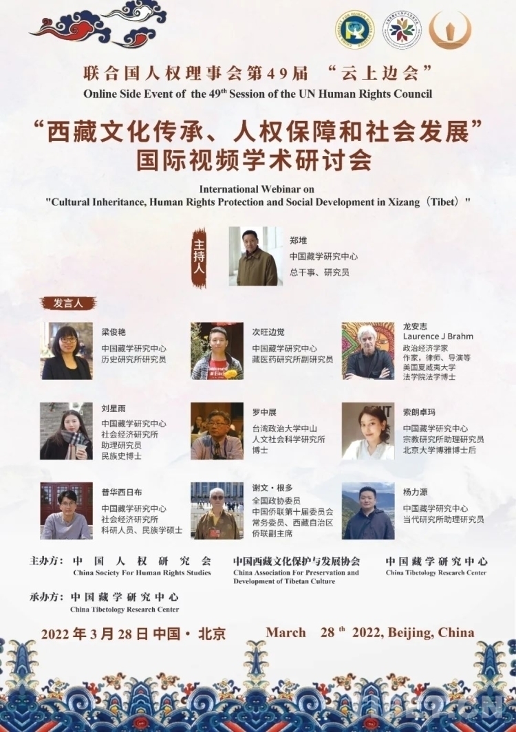 中國(guó)西藏網(wǎng)訊 3月28日,聯(lián)合國(guó)人權(quán)理事會(huì)第49屆“云上邊會(huì)”“西藏文化傳承、人權(quán)保障和社會(huì)發(fā)展”國(guó)際視頻學(xué)術(shù)研討會(huì)在北京舉行,國(guó)內(nèi)外有關(guān)專(zhuān)家學(xué)者40余人以線上線下相結(jié)合的方式參加了研討。