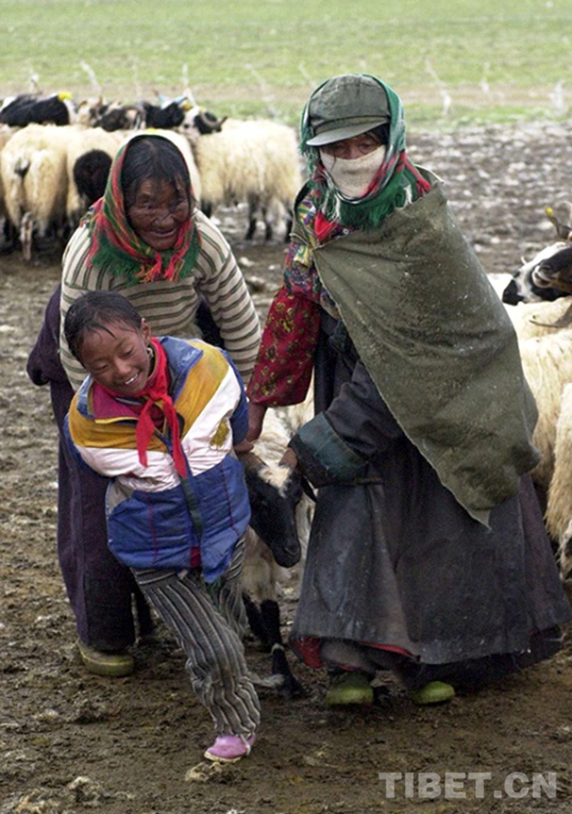 這是嘎措鄉(xiāng)一位小學(xué)生利用業(yè)余時(shí)間,在幫助村民拽拉不肯挪步的羊只統(tǒng)一去擠奶。這種勞動(dòng)到年底也可獲得一定的工分收入(唐召明2001年攝)