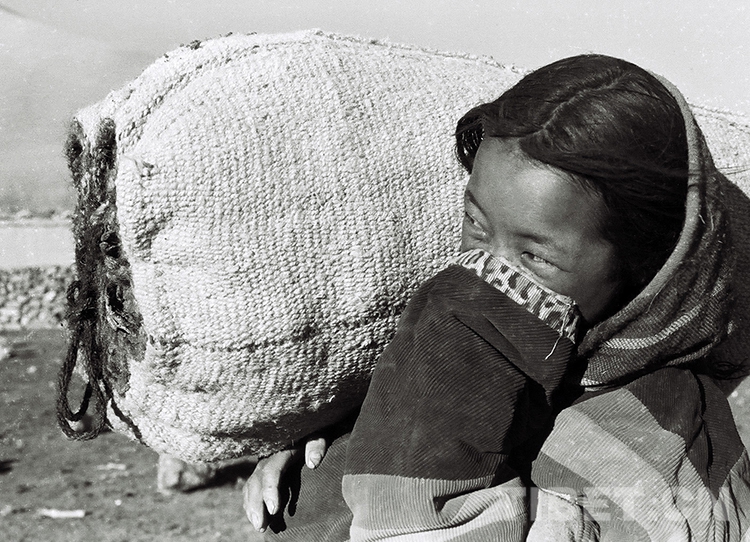這是一名小學(xué)生利用業(yè)余時(shí)間撿拾牛糞,然后肩扛裝好的成袋牛糞去交集體作燃料。這種勞動(dòng)到年底也可獲得一定的工分收入(唐召明1988年攝)