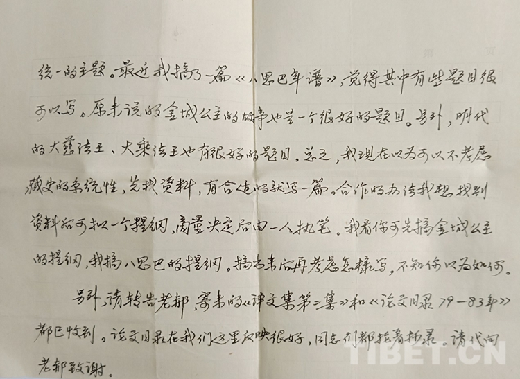 記得我大學畢業(yè)剛到新單位,人生地不熟,加之原來沉浸在“文學夢”中,現(xiàn)在陡然轉(zhuǎn)到藏族歷史研究,所謂基礎不牢地動山搖,困惑加不適,可想而知。陳老師在聊天中得知我的情況后,談到文史不分家,自己對文學也很有興趣,與青?!跺3薄肪庉嫼苁煜?。這樣,我遇到一個學識淵博的良師益友,聆聽指教,何其難得。在陳老師的鼓勵和幫助下,我在惶惑中嘗試把歷史與文學結(jié)合起來,與他合作發(fā)表了歷史故事新編《長安和親》《香波山奇遇—吐蕃聶墀贊普的故事》等,平穩(wěn)地完成了專業(yè)變動的過渡期。后來,他離開中央民族學院到青海社會科學院工作,我們之間仍堅持信件往來,得到他很多幫助。每一次通信,我們談得最多的都是學術。在某次回信中,他談及下一步合作的工作,特別提到“至于今后如何搞,我想原來定的歷史故事新編計劃似乎是太大了一點。主要從藏族史的系統(tǒng)性考慮,而沒有考慮到現(xiàn)實的需要。所以我想還是先寫主題符合現(xiàn)實需要的題目,寫歌頌民族團結(jié)、文化交流,國家統(tǒng)一的主題。最近,我搞了一篇《八思巴年譜》,覺得其中有些題目很可以寫。原來說的金城公主的故事也是一個很好的題目。另外,明代的大慈法王、大乘法王也有很好的題目??傊椰F(xiàn)在認為可以不考慮藏族史的系統(tǒng)性,先找資料,有合適的就寫一篇。合作的辦法我想找到資料后,可擬一個提綱,商量決定后,由一人執(zhí)筆。我看你可先搞金城公主的提綱,我搞八思巴的提綱,搞出來后再考慮怎樣寫,不知你以為如何。”
