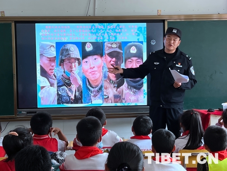 中國(guó)西藏網(wǎng)訊 “同學(xué)們,大家知道照片上這位英雄是誰(shuí)嗎?”伴隨著民警周升展的提問(wèn)聲,孩子們紛紛舉起手回答出了這位英雄——祁團(tuán)長(zhǎng)?!澳銈冋媛斆?,今天叔叔給大家講一講新時(shí)代衛(wèi)國(guó)戍邊英雄祁發(fā)寶團(tuán)長(zhǎng)的故事……”