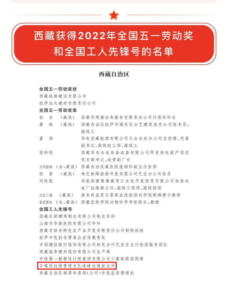 中國(guó)西藏網(wǎng)訊 2022年4月28日,中華全國(guó)總工會(huì)發(fā)布2022年全國(guó)五一勞動(dòng)獎(jiǎng)和全國(guó)工人先鋒號(hào)表彰人選(集體)名單,西藏出入境邊防檢查總站日喀則邊境管理支隊(duì)珠峰邊境派出所獲“全國(guó)工人先鋒號(hào)”稱(chēng)號(hào)。
