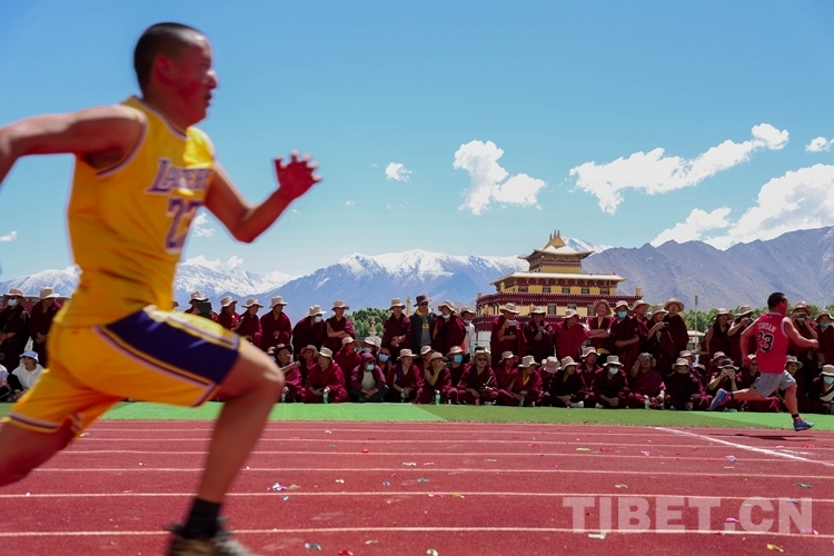 圖為僧人在百米短跑比賽中 攝影:賈華加