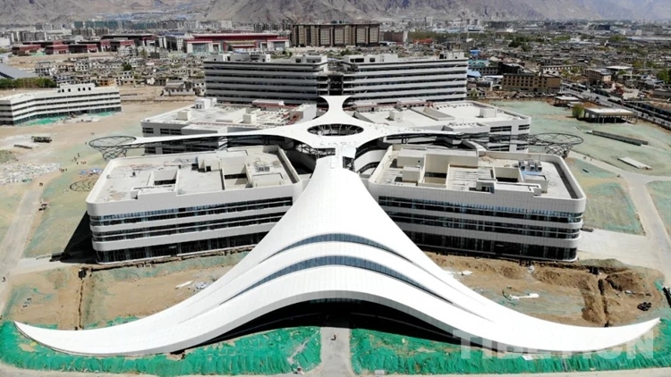 圖為從空中俯瞰西藏自治區(qū)醫(yī)院項(xiàng)目施工現(xiàn)場(chǎng)