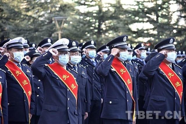 圖為2022年1月10日上午,西藏自治區(qū)公安廳組織民警迎接第二個中國人民警察節(jié)。現(xiàn)場,全體民警舉右拳進行人民警察誓詞宣誓