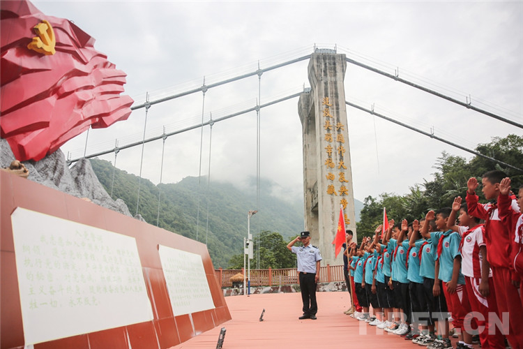 圖為背崩邊境派出所民警在解放大橋愛國(guó)強(qiáng)邊教育基地為學(xué)生講解“老墨脫精神”