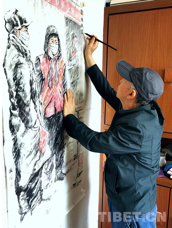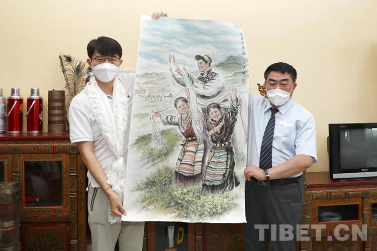 “我愛人看到了咱們館(西藏文化博物館)發(fā)的征稿啟事,然后就把這條信息發(fā)到家庭群里邊。過了不久,我父親說他畫了一張畫,讓我看看畫得怎么樣。我當(dāng)時(shí)還很意外,本來想鼓勵(lì)我兒子畫一張,結(jié)果我兒子沒畫,老爺子畫得還很好?!?月21日,張兆林先生將自己的作品《哈達(dá)寄深情》捐贈給西藏文化博物館,張兆林之子張安誠將作品送至博物館并收到了捐贈證書。
