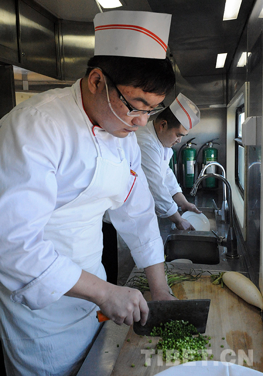 我在北京鐵路客運段京藏列車第二組的餐車?yán)锟吹?,列車在通過唐古拉山區(qū)段時,餐車正在為旅客提供炒菜服務(wù)。我采訪的廚師長孫冠軍告訴我,京藏列車自開通運營以來,除了像西紅柿炒雞蛋因高原沸點低而無法炒成片外,其他三四十種可口飯菜都能在列車運行中的高海拔地段完成。