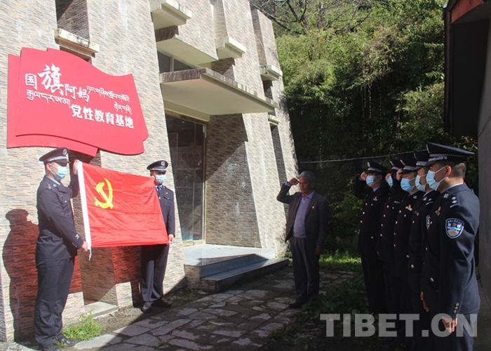 圖為民警在樟木鎮(zhèn)國(guó)旗阿媽黨性教育基地前重溫入黨誓詞