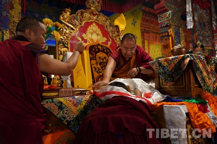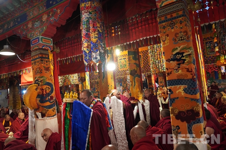 法號(hào)齊鳴、法鑼合奏,眾僧以隆重的宗教儀軌迎接班禪。班禪抵達(dá)藏傳佛教格魯派祖寺甘丹寺后在僧眾的簇?fù)硐?,先后步入羊?jiān)多康殿、宗喀巴大師靈塔殿、十八羅漢殿朝拜、誦經(jīng)、敬獻(xiàn)哈達(dá)。