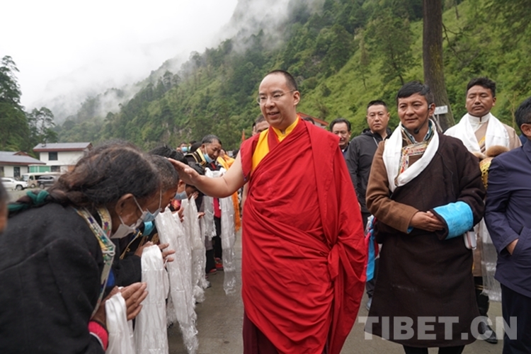 調(diào)研結(jié)束,班禪徒步走出珞瓦新村,為村口列隊歡送的信教群眾一一摸頂賜福,并給村內(nèi)所有信教群眾送上了經(jīng)過加持的金剛結(jié)、法相照片和像章。
