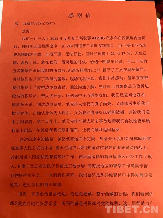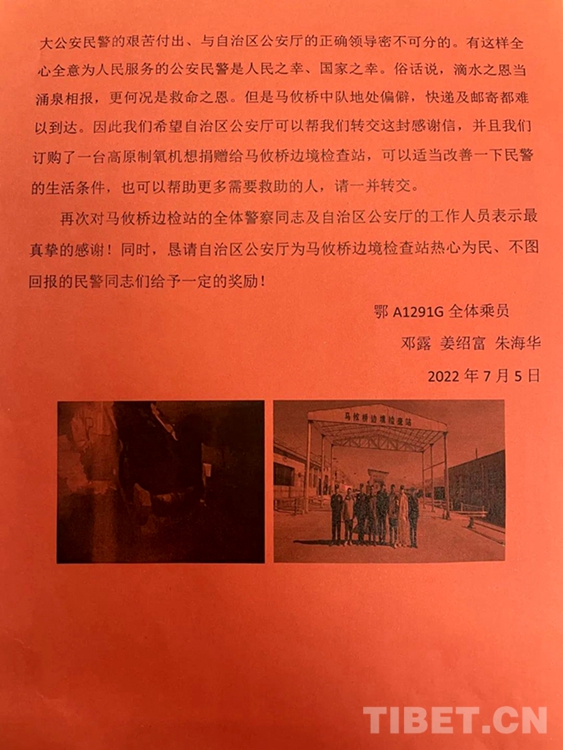 中國(guó)西藏網(wǎng)訊 近日,西藏自治區(qū)阿里邊境管理支隊(duì)馬攸橋邊境檢查站(以下簡(jiǎn)稱(chēng):馬攸橋邊境檢查站)收到了一份署名為“鄂A1291G全體乘員”的包裹,里面包含了一面錦旗,一封感謝信,還有一份特別的禮物。
