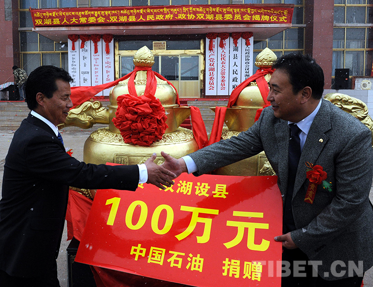 這是對口援助單位的中國石油為雙湖設(shè)縣捐贈100萬元。經(jīng)國務(wù)院批準,2013年7月26日,雙湖特別區(qū)“撤區(qū)建縣”正式掛牌(唐召明2013年7月26日攝)