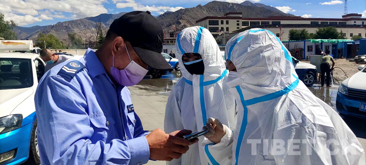 圖為在拉薩貢布堂路出租車(chē)洗車(chē)消毒點(diǎn),出租車(chē)駕駛員和兩位防疫志愿者交流核酸檢測(cè)結(jié)果查詢(xún) 攝影:趙良發(fā)