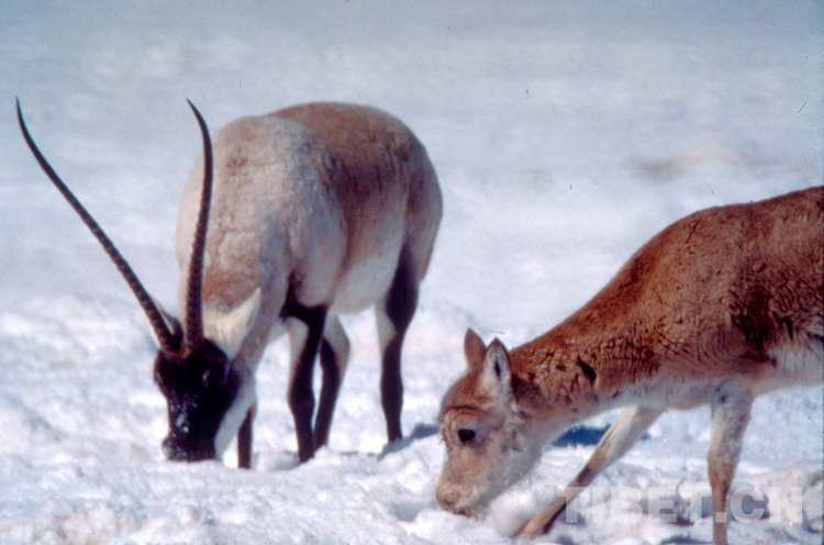 這是一對(duì)在羌塘國家級(jí)自然保護(hù)區(qū)雪地里覓食的國家一級(jí)保護(hù)動(dòng)物藏羚羊(唐召明提供,2007年6月21日攝)