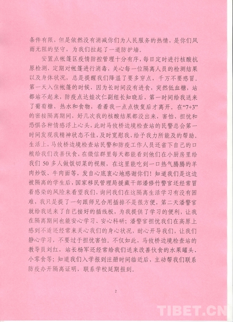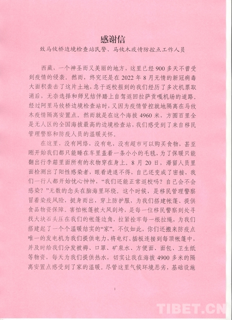 一次次走訪,一件件回應……這一系列真實、暖心的舉動,讓馬攸橋邊境檢查站的民警與滯留群眾建立了深厚情誼,也讓2人滯留結(jié)束回到北京后,寫下了這封感謝信。陸詩鳴、張圣聽的真情流露,飽含著群眾對馬攸橋邊境檢查站民警的信任,讓這個海拔4900多米的臨時安置點顯得更加溫暖。(中國西藏網(wǎng) 通訊員/張拴根 唐彪 記者/次旦拉姆 馬攸橋邊境檢查站供圖)