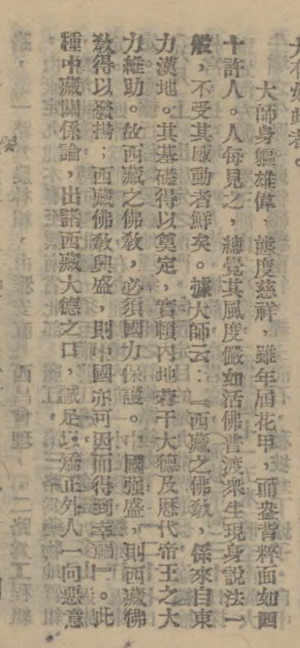 次年,應(yīng)重慶漢藏教理院和成都佛學(xué)社的邀請,東本格西決定前往當(dāng)?shù)刂v法。期間,日本空襲不斷,拉薩官民與弟子因憂慮東本格西安危,力勸其勿前往。但是,東本格西從佛教利益世間的角度出發(fā),認(rèn)為在當(dāng)?shù)孛癖娍嚯y之際,作為僧人更應(yīng)不懼危險,前往當(dāng)?shù)匚拷迕癖?,以紓解?zhàn)爭造成的創(chuàng)傷與苦痛。1943年1月,東本格西從拉薩啟程前往理化(今理塘),參加九世班禪靈童尋訪測驗事宜。4月,經(jīng)由康定抵達(dá)成都,沿途受到各地政府官員與僧俗弟子的歡迎。東本格西應(yīng)中國邊疆問題研究會邀請講演“佛教與邊疆”,蒙藏委員會委員格桑澤仁翻譯。[3]講演內(nèi)容主要分為三部分:首先,詳細(xì)敘述藏傳佛教發(fā)展演變的歷史,提出因于歷代高僧與中央政府的大力維護(hù)與資助,藏傳佛教發(fā)展的基礎(chǔ)才得以奠定;其次,分析邊疆佛教的分布與信仰狀況;最后,分析佛教與邊疆的關(guān)系。[4]他在講到佛教昌盛與國家實(shí)力發(fā)展之間的關(guān)系時,明確提出“西藏之佛教,必須國力保護(hù),中國強(qiáng)盛,則藏傳佛教得以發(fā)揚(yáng),藏傳佛教興盛,則中國亦可因而得到幸?!盵5]。東本格西從歷史和現(xiàn)實(shí)角度詮釋西藏作為中華民族共同家園的角色,邊疆不惟具體的地理概念和信仰文化差異的標(biāo)簽,而是中央政府長期支持發(fā)展的歷史凝結(jié),是中華民族共同家園的一分子。