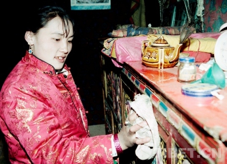 這是文部辦事處(現(xiàn)尼瑪縣)招待所服務員索娜,她家從新疆回遷到文部辦事處吳爾多鄉(xiāng)(唐召明1989年12月攝)