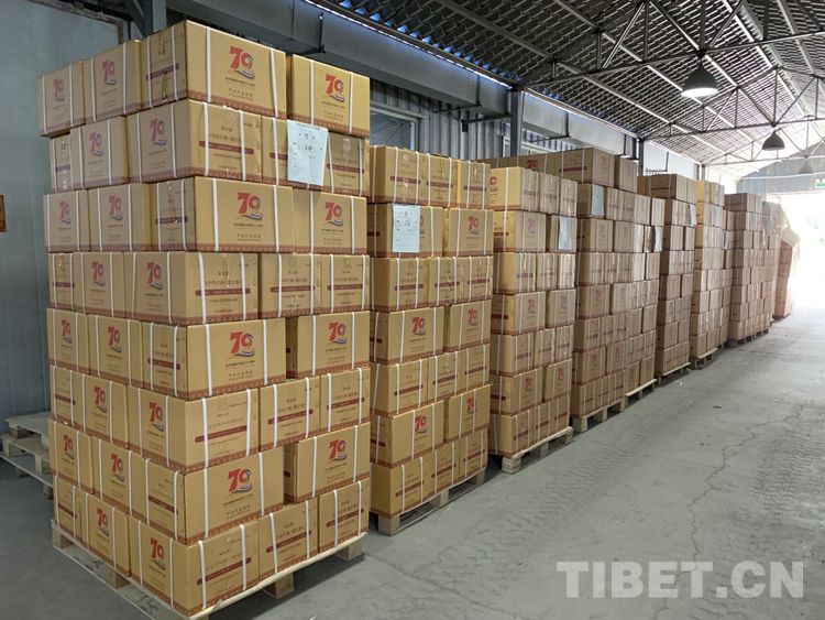 圖為2021年,出席西藏和平解放70周年慶祝活動的中央代表團(tuán)作為禮品之一贈送西藏各寺廟的《中華大典?藏文卷》第一批14種文集201卷經(jīng)精心包裝即將運(yùn)往西藏