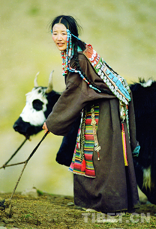 這是嘉黎縣一位佩戴豪華服飾的牧女在拴牦牛 (唐召明1997年攝)