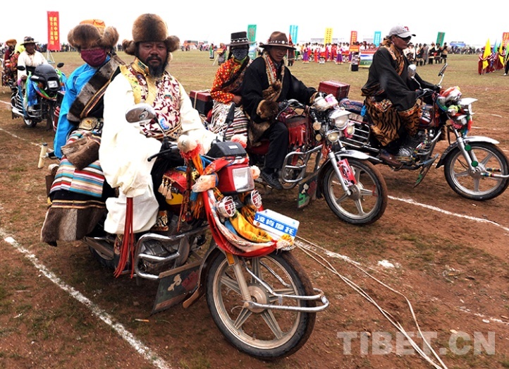 這是在雙湖縣慶祝建縣儀式上,著盛裝的牧民摩托車車隊(duì)正在通過主席臺(唐召明2013年7月26日攝)