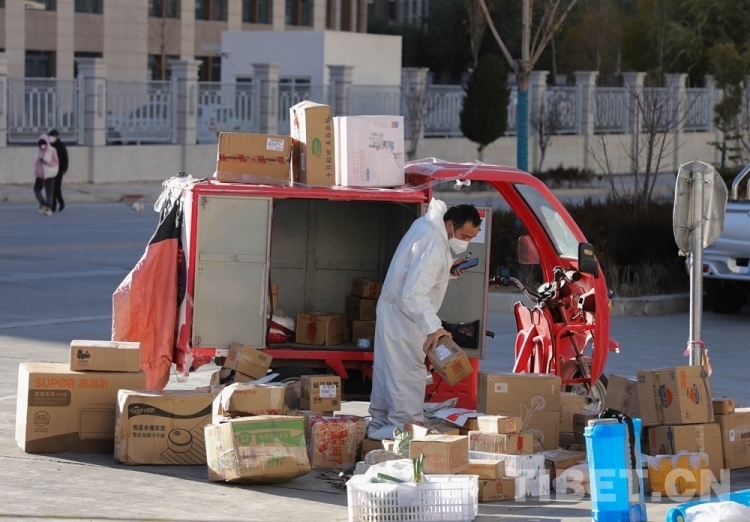 中國西藏網(wǎng)訊 隨著拉薩市疫情防控形勢整體持續(xù)向好,目前拉薩市郵政快遞業(yè)在落實好常態(tài)化疫情防控工作的基礎(chǔ)上,正有序復(fù)工復(fù)產(chǎn)。圖為快遞員無接觸配送快遞 攝影:賈華加(中國西藏網(wǎng) 記者/賈華加)