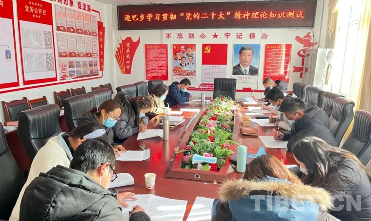 圖為洛扎縣邊巴鄉(xiāng)黨委理論學(xué)習(xí)中心組學(xué)習(xí)貫徹黨的二十大精神并進(jìn)行黨的二十大精神理論知識測試。(中國西藏網(wǎng) 記者/賈華加 圖片來源:洛扎縣宣傳部)
