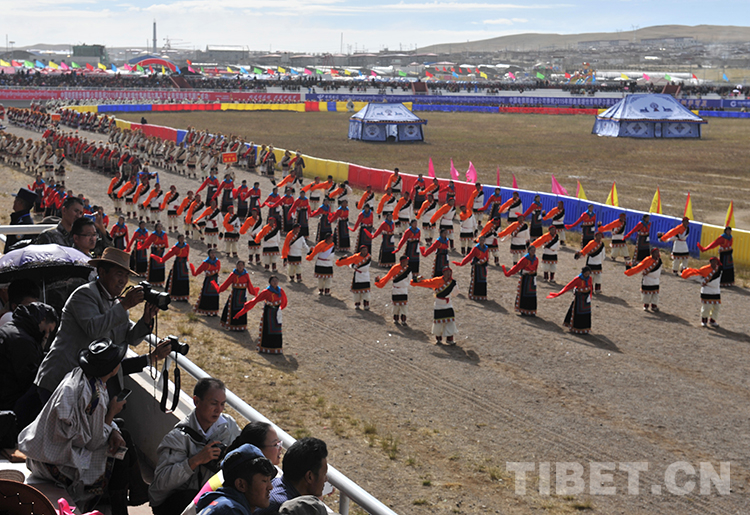 這是來自那曲地區(qū)(現(xiàn)那曲市)各縣代表隊在進行入場式表演。當日,那曲賽馬藝術(shù)節(jié)在藏北首府那曲鎮(zhèn)開幕(唐召明2013年8月10日攝)