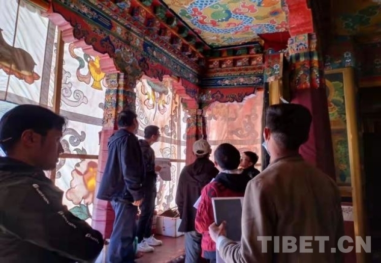 圖為2021年,西藏民族大學(xué)實習(xí)生參與檢查杰拉康寺木構(gòu)建筑的破損程度,并對設(shè)計方案提出意見