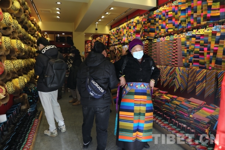 在去八廓街的路上,街邊的一家藏裝店吸引了記者的目光,店內(nèi)的藏裝款式多樣,邦典色彩艷麗、種類繁多,一排排的次仁金果(藏式帽子)做工精細、款式新穎,在陽光的照耀下金光閃閃,十幾平米的小店顧客盈門。