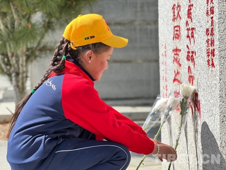 圖為西藏日喀則市昂仁縣多白鄉(xiāng)小學(xué)生為革命先烈敬獻鮮花 攝影:德吉卓瑪