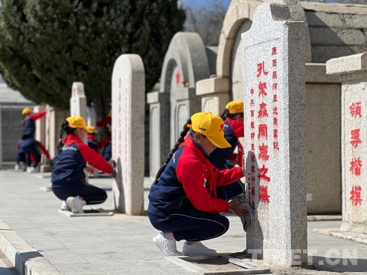 圖為學(xué)生們擦拭革命先烈的墓碑 攝影:德吉卓瑪