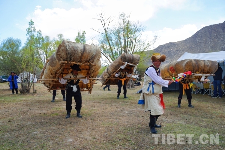 當(dāng)天恰好是周六,從拉薩來體驗(yàn)的游客不在少數(shù),有的是觀看了抖音直播就馬上騎車過來體驗(yàn)的。在營地,大家欣賞到了當(dāng)?shù)氐摹肮挝琛保ㄅFご瑁?,廓孜由邊唱邊跳的“阿熱”和身背牛皮船跳舞的“船夫”合作表演?!鞍帷笔枪挝柚械念I(lǐng)舞者,跳牛皮船舞時,“阿熱”手執(zhí)“塔塔”(五彩旗桿),唱著歌,跳著舞,另外4位舞者看著“阿熱”的動作,背著重約80斤的牛皮船,用同樣的動作跟著“阿熱”跳舞。大家動作整齊,船漿擊打船舷的“咚咚”聲不絕于耳。