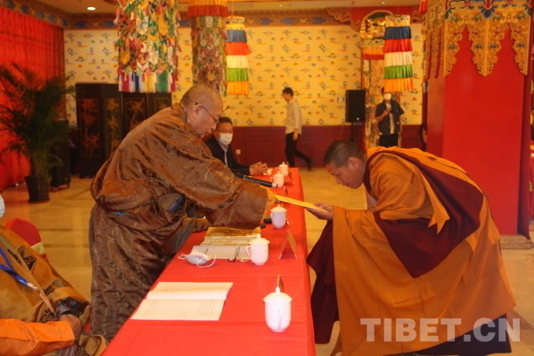 中國佛教協(xié)會(huì)副會(huì)長、藏傳佛教學(xué)銜工作指導(dǎo)委員會(huì)主任、中國藏語系高級(jí)佛學(xué)院院長嘉木樣活佛向“拓然巴”高級(jí)學(xué)銜獲得者頒發(fā)學(xué)銜證書。中國佛教協(xié)會(huì)副會(huì)長、藏傳佛教學(xué)銜工作指導(dǎo)委員會(huì)副主任珠康·土登克珠活佛向“拓然巴”高級(jí)學(xué)銜獲得者表示祝賀。