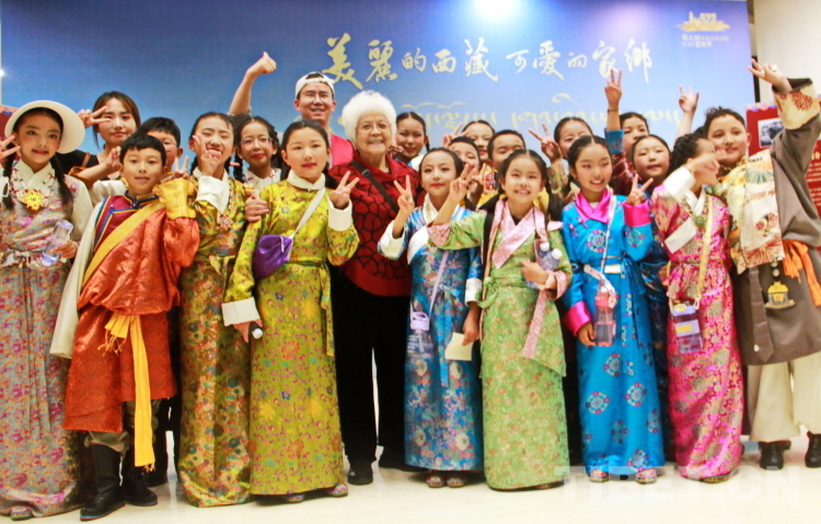 圖為《洗衣歌》編導(dǎo)、詞作者李俊?。ㄇ芭抛笪澹┡c西藏珠峰少年合唱團(tuán)的小朋友們合影 攝影:劉莉