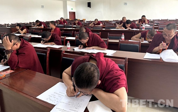 圖為中國藏語系高級佛學院2023年“拓然巴”高級學銜班招生考試(西藏)考點的筆試現(xiàn)場