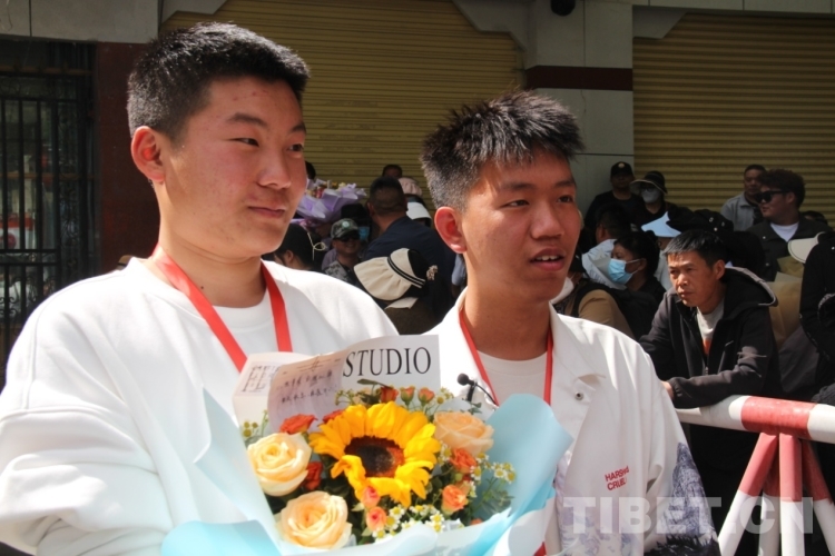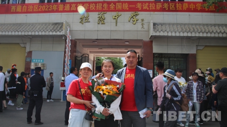 6月8日下午,在拉薩中學(xué)考場外,家長們穿著藏裝、旗袍、印有“金榜題名”“旗開得勝”等加油短袖,手捧鮮花和哈達(dá)迎接第一波結(jié)束高考的考生?!敖裉欤|女終于要結(jié)束高中生活了,希望她能如愿考上軍校。”劉先生夫婦穿著專門為女兒定制的加油短袖,備好鮮花到考場外迎接女兒。像他們一樣,考場外拿著鮮花與哈達(dá)、祝賀橫幅、勵志牌等的考生家屬和親戚漸漸多了起來。